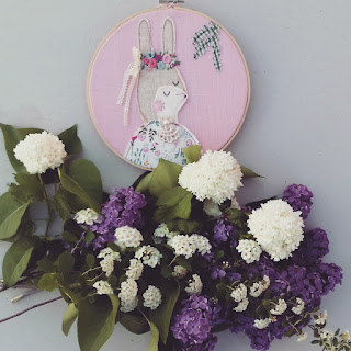 Kolejna ilustracja na tamborku, przedstawia króliczą pannę w wianku na głowie.