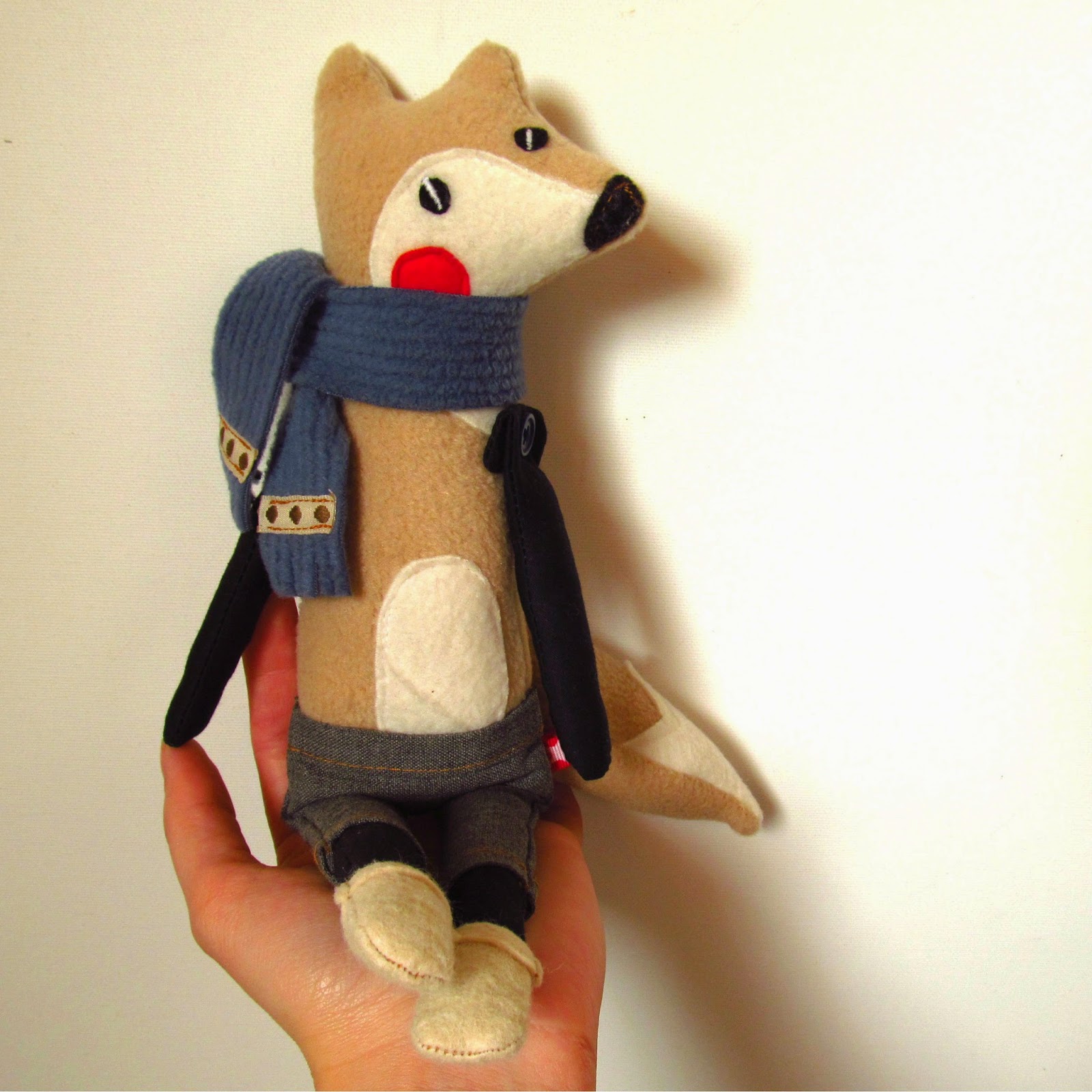 Wesoły lisek, zadziorny i bardzo towarzyski. Idealny przyjaciel dla małego chłopca lub dziewczynki. Ma ściągane szorty na jedną szelkę, wełniane skarpety i apaszkę. Mięciutki ogonek swobodnie z tyłu dynda. łapki przeszyte na guzikach, pozwalają swobodnie je podnosić do góry i opuszczać, ale wspólne wędrówki były jeszcze wygodniejsze. Ma ponad 40 cm wzrostu, w sam raz aby wędrować pod pachą. Lisek może być personalizowany. Na zamówienie mogę wyszyć imię bądź inicjały dziecka, np. lisek ze zdjęcia w serduszku ma pierwszą literę imienia właściciela